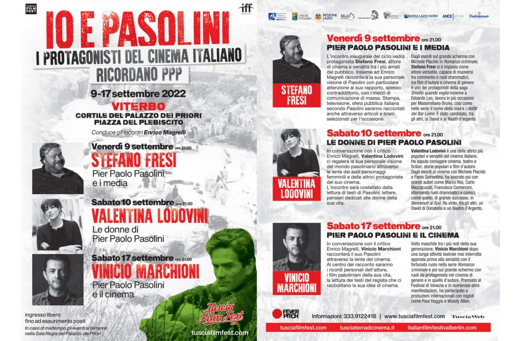 Insieme alla mostra PPP100. Pasolini e… poesia, cinema, televisione, stampa visitabile presso il Museo dei Portici di Viterbo fino al 17 settembre 2022, approda nel capoluogo nella Tuscia dopo la tappa berlinese di luglio Io e PPP. Il cinema italiano ricorda Pasolini. Un ciclo di tre incontri – condotti da Enrico Magrelli, direttore artistico del Tuscia Film Fest – in programma nel cortile del Palazzo dei Priori di Viterbo durante i quali tre attori italiani parleranno del loro rapporto con Pier Paolo Pasolini e la sua opera e ricorderanno alcuni suoi pensieri.