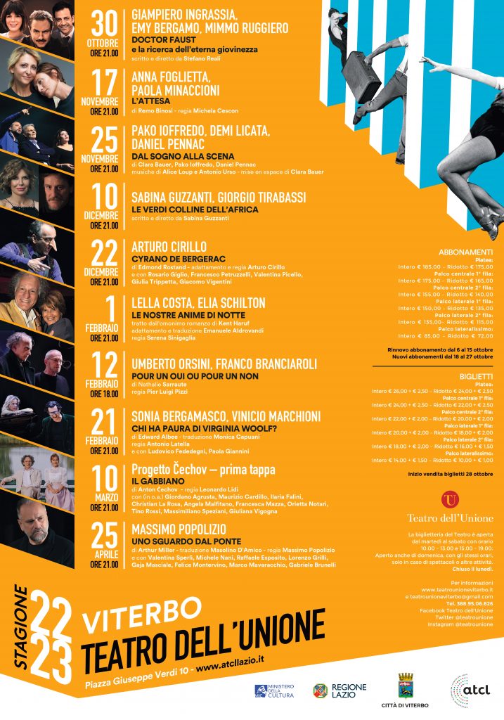 Drammaturgia contemporanea e grandi classici, importanti interpreti e registi della scena teatrale italiana e non solo: sono questi gli ingredienti di una stagione teatrale che saprà appassionare il pubblico con 10 serate ognuna diversa e stimolante al Teatro dell’Unione, grazie alla collaborazione tra il Comune di Viterbo e ATCL – Circuito multidisciplinare del Lazio sostenuto da MIC – Ministero della Cultura e Regione Lazio.